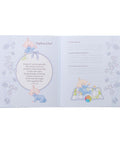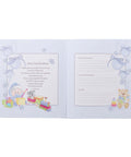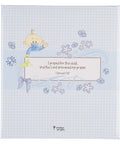 A sweet blue gingham design decorates the covers of the memory book for boys. A die-cut photo frame on the front cover allows you to personalize the baby book by adding a special photo. Sweet bugs and butterflies crawl across the front cover onto the back, where a Scripture verse and a picture of a baby boy are displayed.