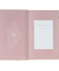 The floral detail continues on the spine and the back cover. The title and translation name are also framed on the spine. Topstitching along the edges ensures lasting durability. Thumb indexing lets you flip easily between books, and the pink satin ribbon marker helps you keep your place. Gold gilt-edged pages catch the light with every turn and echo the timeless beauty of Scripture.