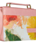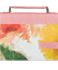 A smooth pink faux leather back panel, heat-debossed with a row of wildflowers, wraps around the spine of the Bible cover and attaches to a printed front panel with a double row of topstitching. Oversized and abstract flowers are softened by a sunset palette of blush pink, sunflower yellow, forest green, and fuchsia pink-colored watercolor faux leather panel. Gold foil traces the outline of a line-drawn bouquet superimposed on the left of the colorful floral background. A smooth, pink leather patch holding the heat-debossed sentiment is appliquéd across from it.