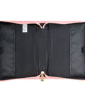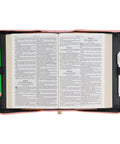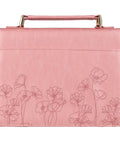 Other exterior design features include a pink slip pocket on the back panel, gold handle hardware, a lay-flat carry handle, and a gold cross-engraved zipper pull. Inside the Bible case are two pen loops that allow you to store pencils, pens, or highlighters.