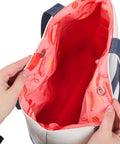 The 100 % polyester tote is made for muddy paws and muddy toys. It is durable and dries quickly, and the bright colors will not fade. The bag's interior is lined in a bright red-orange fabric patterned in a subtle print of doggy toys and accessories. A zippered inner pocket lets you store keys, lipstick, or dog treats and a magnetic closure makes it easy to pop the bag open or shut in an instant.