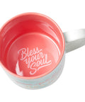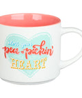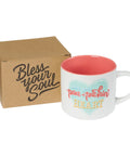 This ceramic mug is white on the outside, with a large heart-shaped design printed on one side. The light aqua-colored heart frames the sentiment written in blue, red, and yellow. A heart design on the back echoes the front and adds an extra touch of cuteness. The inside is shaded a light coral color with the signature Bless Your Soul imprint on the bottom for when you drink your whole cup. With its bright colors and Southern charm, the Pea Pickin’ Heart Ceramic Coffee Mug is a great way to enjoy your favorite drink!