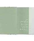 The devotional Bible features a light gray pearlized cover screen-printed with an enchanting pink floral watercolor design that encircles the pink-foiled title.