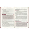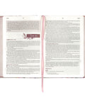 This Bible makes for an exquisite gift, and it comes with a presentation page at the front that enables the giver to add a personal touch—a special message, date, or dedication. Inside, you'll find a satin ribbon marker for marking select passages or tracking your progress and pink printed page edges for an additional pop of color. The Bible boasts several features designed to enhance readability, such as a 10-point font, text printed in both black and brown, and a single-column format presentation. In addition, the Bible is Smyth-sewn, ensuring a sturdy binding that stands the test of time. It opens completely flat, revealing all the text on the page for a seamless reading experience.