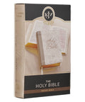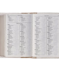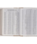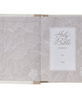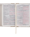 The white front and back panels are connected by a pearly taupe spine that repeats the title and version reference in gold foil. A coordinating satin ribbon marker that matches the taupe faux leather spine helps you keep your place, and beautiful gilt-edged pages add a subtle sheen to the design. The Bible opens completely flat thanks to its Smyth-sewn lay-flat binding.