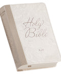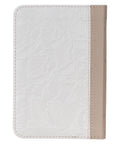 The Pearlized White and Taupe Faux Leather King James Version Pocket Bible is perfect for a graceful lady. Its elegant design, with pearlized white and taupe covers, and highly portable size make it the ideal Bible to pack for travel.