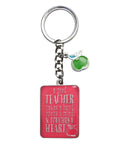 A 1.2-inch split metal key ring is attached to the medallion by a 1-inch silver metal link chain that loops through a small ring at the top of the medallion. An adorable green enamel apple-for-the-teacher charm is attached to the link chain. A closer look at the split key ring reveals #1 Teacher softly etched on the rim.