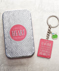 The key ring comes packaged in a silver quatrefoil embossed gift tin with a bright pink circle that holds an additional message.