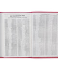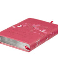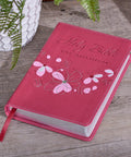 A continuous blossom design that starts on the front cover, wraps around the spine, and continues on the back cover decorates this pink faux leather Bible. Select pink and white petals are colored and accented with silver foil. The tile is heat-debossed in a scripted font, and the version reference is heat-debossed in capitalized letters.