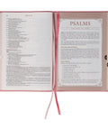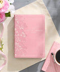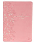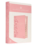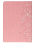 The spine of the pink faux leather Bible is embellished with a heat-debossed outlined creeping clematis design. Light pink accents are added to the petals to create dimension and depth in the design. The title is presented in clear gold-foiled letters.