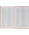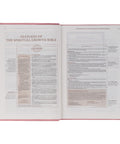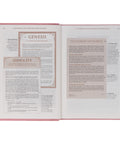 Luxury features of this Bible include a presentation page, gilt-edged pages, ribbon markers, a thumb index, and an index of authors and articles in the back. In addition, the presentation page in the front can be personalized and states the premise for the design of this beautiful Bible.