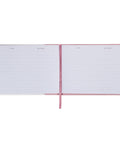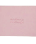 Gracing the exterior is a blush faux leather cover that seamlessly extends from the back panel over the spine, merging into a printed faux leather front panel. This white front panel showcases two elegant floral swags featuring plump pink and yellow roses that delicately flank the frame surrounding the title. The title itself is tastefully embossed in copper-foiled letters that harmoniously coordinate with the copper-foiled border of the frame.