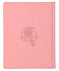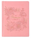 The beautifully designed KJV My Promise Bible has a pink faux leather hardcover heat-debossed with an impressive floral design that accented with gold foil. The title is heat-debossed and accented in gold foil and placed inside the design.