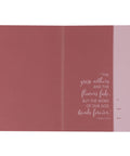 The front cover of this softcover Bible showcases oversized lilies shaded in various hues of pink, ranging from light to dark. This beautiful scene is complemented by a contrasting navy blue spine. The sentiment is presented in an elegant gray embossed multi-font design in the center of the front cover, with the version reference right below it.