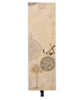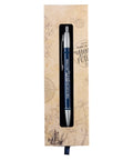 The retractable black ink pen comes packaged in a slide-out gift box with a navy blue satin ribbon pull. The sand-colored gift box is decorated with a nautical theme.