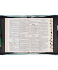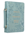 This cover's scuff-resistant faux leather construction keeps your Bible safe whether you use it home or take it to church. A teal lay-flat handle runs along the spine, with gold metal hardware securing it to the cover for an easy grip. A cross-engraved gold zipper pull keeps the cover securely closed, so you can keep sermon notes and prayer cards tucked safely inside. You can also keep your writing supplies at the ready with the two interior pen loops. An exterior slip pocket is included to hold loose notes and church bulletins.This Bible cover is available in two sizes: medium and large. Please refer to the last image in the image carousel on the left for the Bible Cover Sizing Chart before you make a selection.A daughter or granddaughter would find comfort in reading the sentiment on this cover as she opens it up to complete her daily devotions. Include the Plans to Prosper You Teal Faux Leather Fashion Bible Cover in a care package or thank-you present to create a thoughtful gift.- Heat-debossed floral design