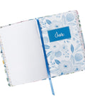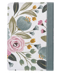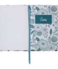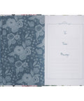 The floral printed flexcover has a dusty greenish gray spine and matching appliquéd title patch and is styled in a traditional half-bound design with a modern floral twist. Oversized flowers in pink and gray-green tones fill the silky smooth front and back covers. The floral design is carried over to the page edges that feature a printed floral design. The title is printed in white and pink lettering on the appliquéd patch that is attached with white topstitching.