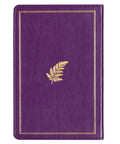 The purple faux leather cover of the prayer book is decorated with gold-foiled fern leaves surrounded by a gold-foiled frame.