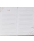 - Heat-debossed floral cover design accented in white
