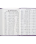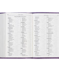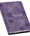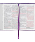 The spine features the version reference printed in white. Silver gilt-edged pages and a coordinating purple satin ribbon marker adds to the charm of this compact Bible.