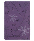 The front and back covers of the purple faux leather Bible feature a collection of heat-debossed and white printed Japanese Maple leaves accented by a series of heat-debossed dots. White topstitching along the edges of the Bible adds strength and durability to a beautiful design. The title appears printed in white on the front cover.