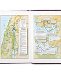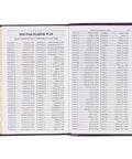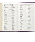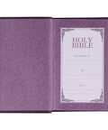 The frame and scroll motif are repeated on the back cover. The same gold-foiled and heat-debossed title appears on the spine, where gold-foiled and heat-debossed spine ribbing adds an extra touch of elegance. Gold gilt-edged pages and an attached purple satin ribbon page marker add style to an already beautiful design. The lay-flat binding of the flexcover Bible allows it to open completely flat without damaging the spine.