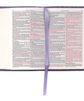An attached purple satin ribbon page marker holds your place between silver gilt-edged pages. The lay-flat flexcover allows the Bible to open flat without any damage to the spine. Inside the Classic King James Version Pocket Bible, you'll find reader-friendly subheadings, a double-column format, a thematic Scripture verse finder, the words of Christ in red, and a one-year Bible reading plan. Because of the compact and highly portable size, the text is presented in a smaller 6-point type. The Bible comes packaged in a full-color printed cardboard sleeve.