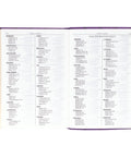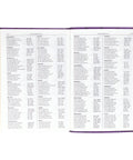 Gilt-edged pages complement the gold foil on the cover, and an attached purple satin ribbon bookmark enhances the design's beauty. Topstitching around the edges of the Bible and the center band lends durability and strength to the design, and the lay-flat binding allows the Bible to open flat without damaging the spine.