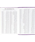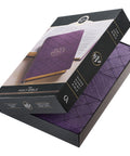 An uncomplicated heat-debossed geometric diamond design wraps around the front and back covers of this super giant print Bible. It is broken up by a smooth purple band that holds the gold-foiled title and version reference.