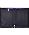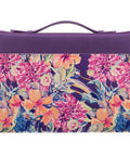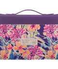 The Purple Floral Blessed Is The One Faux Leather Fashion Bible Cover conveys a sense of peace while providing stylish protection for your Bible. Purple faux leather is used to construct the Bible case and is visible on the spine. Two slip pockets on the front and rear panels feature a full-color floral print against a purple background. A small cream-colored appliquéd faux leather patch on the front panel contains the sentiment in purple foiled letters.