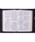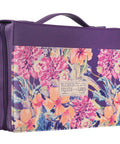 The attached faux leather lay-flat handle on the spine allows the Bible cover to open fully when in use. A cross-engraved zipper pull in silver metal closes the cover securely to protect the Bible and keep any loose papers from falling out. The 2 slip pockets on the front and rear panels are handy to store notes and small notebooks. Inside the Bible case, two pen loops allow you to conveniently carry both a pen and a highlighter. This Bible cover is available in two sizes: medium and large. Please refer to the last image in the image carousel on the left for the Bible Cover Sizing Chart before selecting a size.The Purple Floral Blessed Is The One Faux Leather Fashion Bible Cover is part of the Blessed Collection that includes a faux leather bookmark and a classic faux leather journal in a similar design. The Purple Floral Blessed Is The One Faux Leather Fashion Bible Cover makes a perfect gift for Christian women of any age. It would be an ideal gift for a birthday, Christmas, Mother’s Day, or just to let your friend know that you appreciate her.- Purple Faux Leather