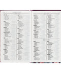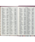 The easy-to-read text is printed in a 14-point font and arranged in a double-column format. Navigating tools include an attached satin ribbon marker, thumb indexing, and a thematic Scripture verse finder. Study tools include a concordance, the words of Christ in red ink, cross-referencing, and 8 full-color maps. A one-year Bible reading plan, included in the back of the Bible, will be your guide to read through the Bible in a year and a presentation page in the front can be personalized when it is given as a gift.