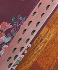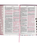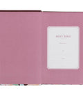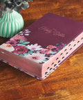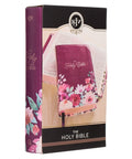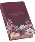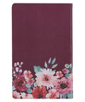 Flowers in every shade of pink stretched across the front, spine, and back panel form a grounding pattern at the bottom of the purple faux leather Bible. The title rises above the illustrations in an exquisite rose gold-foiled script. The spine adds the version reference.
