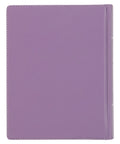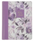 A solid lilac purple faux leather back cover wraps around the spine of the note-taking Bible and meets a printed faux leather front panel decorated in printed purple watercolored flowers and leaves. The seam is secured with a double row of topstitching. A small square appliquéd purple patch with a gold-foiled title is centered in the top half of the front cover.