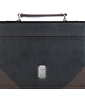 - Black faux leather with walnut brown corner accents and sides