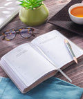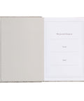 The journal's gilt-edged pages beautifully harmonize with the gold-foiled accents on the cover. The single-color interior offers an arched frame on each page, enclosing a lined space designed for recording answers to the same question over three consecutive years. This layout is designed for a three-year response cycle to the same question, making this a personal growth journal that follows the calendar year, starting on January 1.