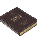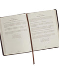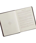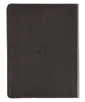 The devotional's rich brown faux leather cover is embellished with a subdued heat-debossed frame with heat-debossed corner scrolls. The gold-foiled title is sandwiched between two flourishes and matches the gold-foiled subtitle right below it.