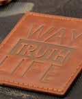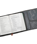 So functional and with a style all its own, our Tri-Fold Realtree Camo Bible Organizer is sure to excite! Perfect for class, Bible study group or the commute, this handy poly-canvas organizer provides uncommon storage features. On the front, you'll find a Velcro tabbed pouch to accommodate your phone, and another with a faux leather tabbed zipper, that is large enough for a wallet. A faux leather strap with Velcro closure pulls the organizer open to reveal another Velcro tabbed pouch, 2 pen compartments, 4 card slots - including one with an ID window, a slip pocket large enough to fit your iPad and many styles of notebooks and journals, a second slip pocket and a zipped mesh pocket. Another zip with a faux leather tabbed zipper, and you have a compartment to envelop your book or Bible and another couple of pens. A suitcase style carry handle and a Way - Truth - Life statement complete the look.This Bible cover is available in two sizes: medium and large. Please refer to the last image in the image carousel on the left for the Bible Cover Sizing Chart before you make a selection.