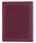 The beautiful red plum faux leather covers are adorned with intricate heat-debossed floral panels and radiate beauty. A centered frame on the front cover, graced with gold-foiled edges, displays the gold-foiled title and version reference, lending an air of elegance and refinement.