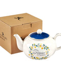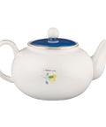 The white ceramic teapot is trimmed with a bright blue lid featuring a white knob. Its rim boasts a delicate gold-foiled frame that matches the gold-foiled sentiment encircled by a wreath of yellow lemon branches.