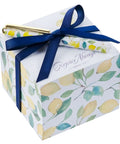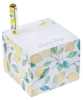 The four sides of the note block are screen-printed with a delightful yellow lemon and green leaf design. Each white tear-off page features a lemon tree branch adorned with yellow lemons and green leaves in the top right corner. The sentiment is elegantly printed in black ink at the bottom center.