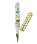 A hole, punched through the top left corner of all the notes creates a pen holder designed to hold the included pen. The pen is adorned with the same lemon and leaf design and is filled with black ink. Additionally, it features a gold tip, clip, and ring.