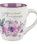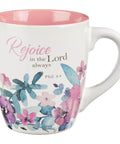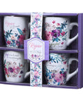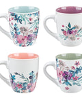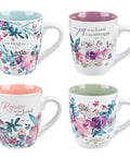Enjoy a coordinated cup of coffee or tea with friends using the adorable mugs from the Rejoice Collection Four Piece Ceramic Coffee Mug Set, decorated with bountiful watercolor florals and positive sentiments taken from Scripture.