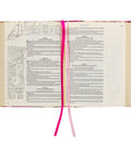 The version reference is elegantly positioned below the title, adorned with gold-foiled letters and beautifully framed in gold foil. Gilt-edged page edges add to the design's luster and complement the gold foil accents on the cover. Two satin ribbon markers that make it possible to mark several pages simultaneously are attached to the spine - one light pink and the other dark pink. A rose-pink elastic band closure wraps around the covers to keep them securely closed. The classic King James Version text is presented in a standard 8.65 pt font.