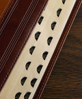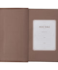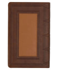 The rich saddle tan cover of this giant print Bible is inlaid with a butterscotch-colored appliquéd panel secured by a double row of topstitching. A simple heat-debossed frame further accents the appliquéd panel and coordinates with the heat-debossed faux spine decorations. The title is heat-debossed within the appliquéd frame and is sandwiched by two heat-debossed decorative line designs. The KJV version reference also appears on the butterscotch-colored panel and is placed within a heat-debossed medallion. The spine title is foiled in gold and matches the gilt-edged pages.