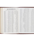 Inside, you'll find a presentation page that can be personalized, reader-friendly subheadings, a double-column format, words of Christ printed in red ink, a thematic Scripture verse finder, and a one-year Bible reading plan. The design includes a flexible cover and lay-flat binding that allows the Bible to open flat for easy readability. The Bible comes packaged in a full-color printed cardboard sleeve.