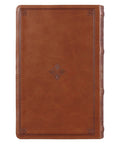 The rich saddle tan cover of the giant print Bible is framed in a heat-debossed border with a corner scroll motif. The scroll motif is repeated in the title design where it sandwiches the gold-foiled title between two heat-debossed scroll flourishes. The gold-foiled version reference is also underscored by a scroll design.