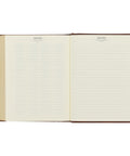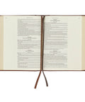 Heat-debossed faux spine ribs are accompanied by elegant heat-debossed flourishes flanking the rose gold-foiled title on the spine. The version reference is displayed in heat-debossed letters at the top of the spine. Gilt-edged pages and two brown satin ribbon markers complete the exterior design.