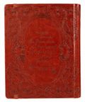 The faux leather hardcover edition features an ornate heat-debossed floral leaf design that is repeated on the back of the Bible. An oval vignette holds the heat-debossed title on the front cover.