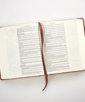 The attached brown satin ribbon page marker will mark your place, and an attached elastic band closure will keep the pages of your Bible securely closed.